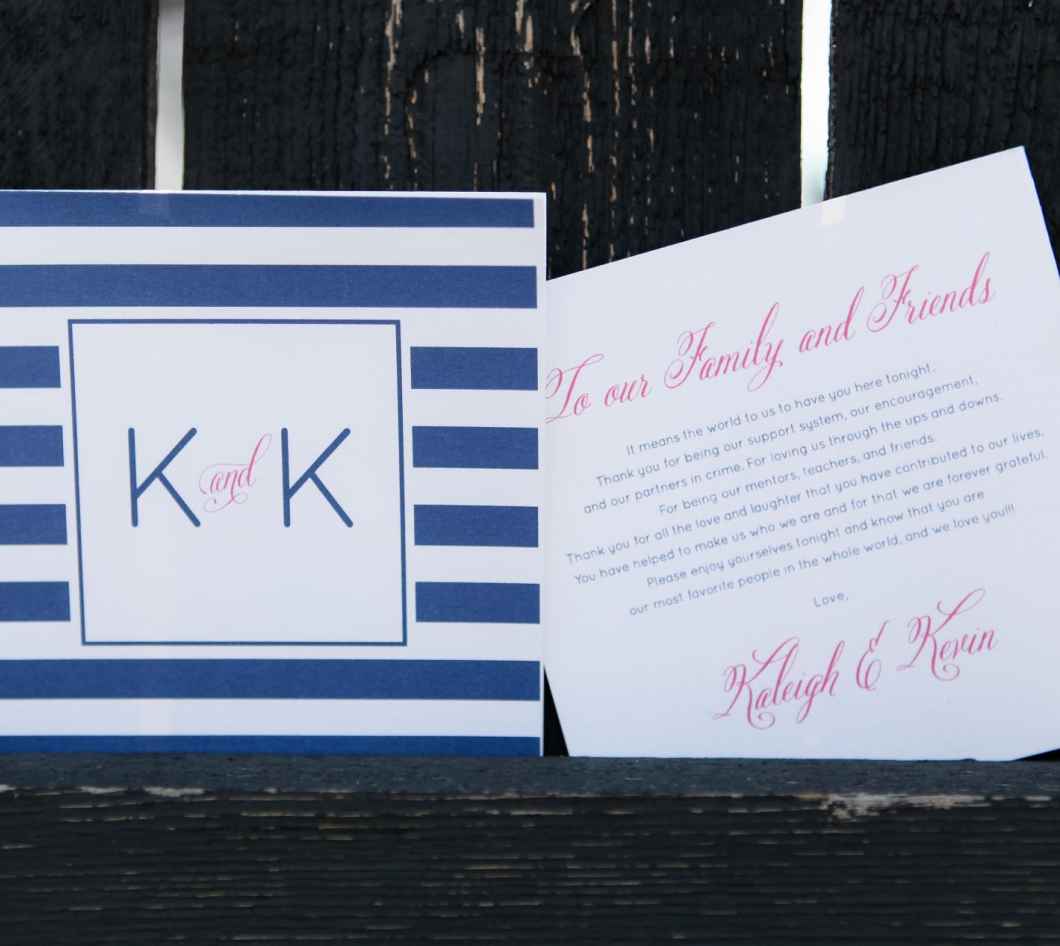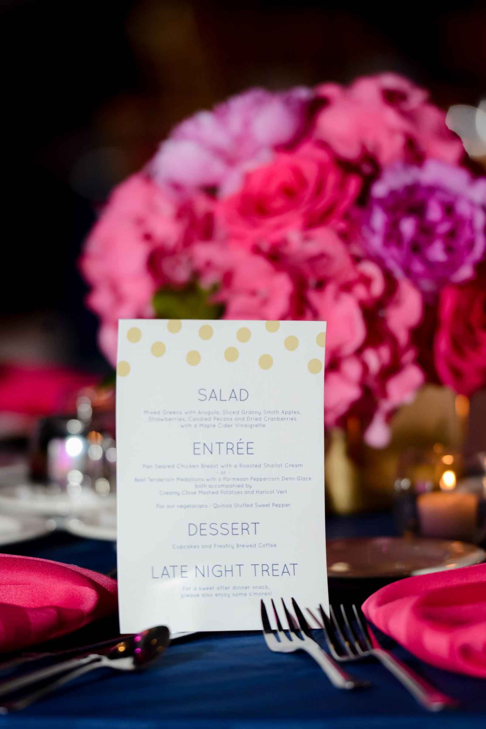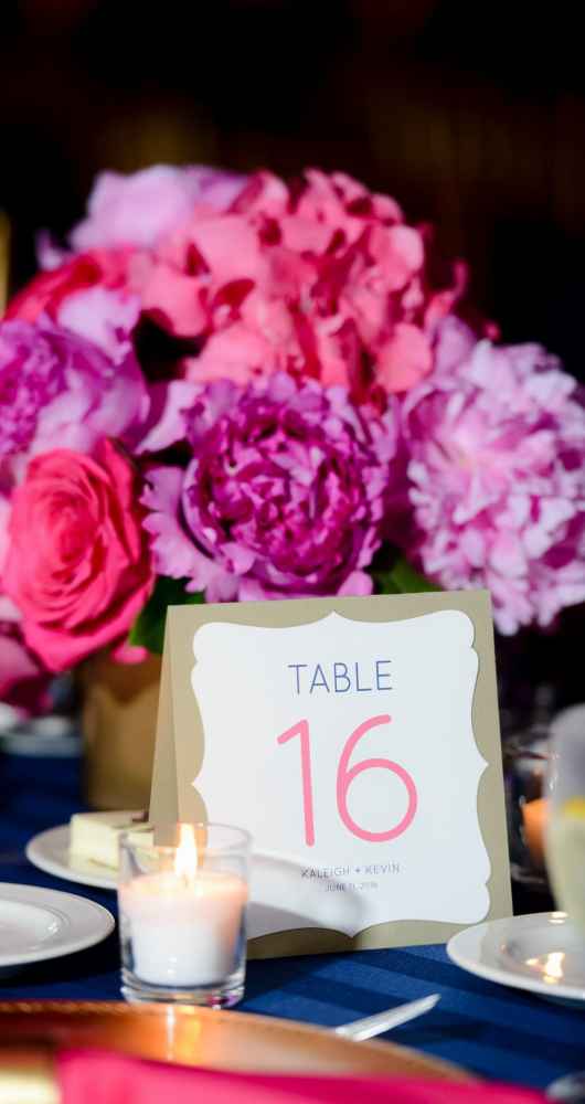 Fuchsia and navy set the tone for the reception décor. Kaleigh has always appreciated the way Kate Spade pairs bright and unique colors together, and since Kaleigh loves the color hot pink, that was an obvious choice. Kevin on the other hand, had his heart set on wearing a navy tux. The unlikely color pairing effortlessly came to life with navy-striped tablecloths, fuchsia napkins and mixed gold centerpieces and plate chargers. Pink uplighting made the occasion all the more dramatic.
