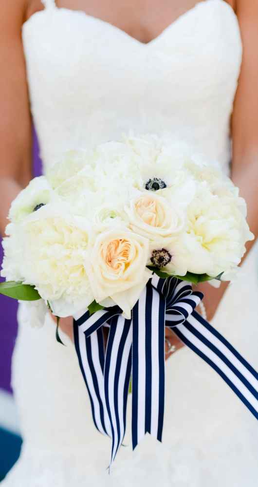The bouquets were kept simple and white, while reception florals contrasted luscious pinks against the navy linens.