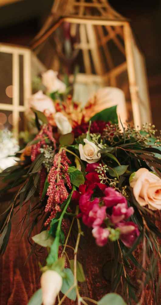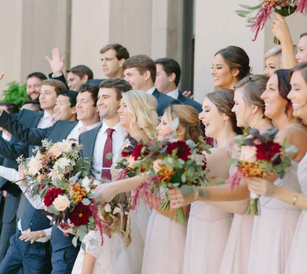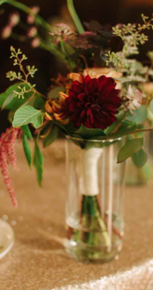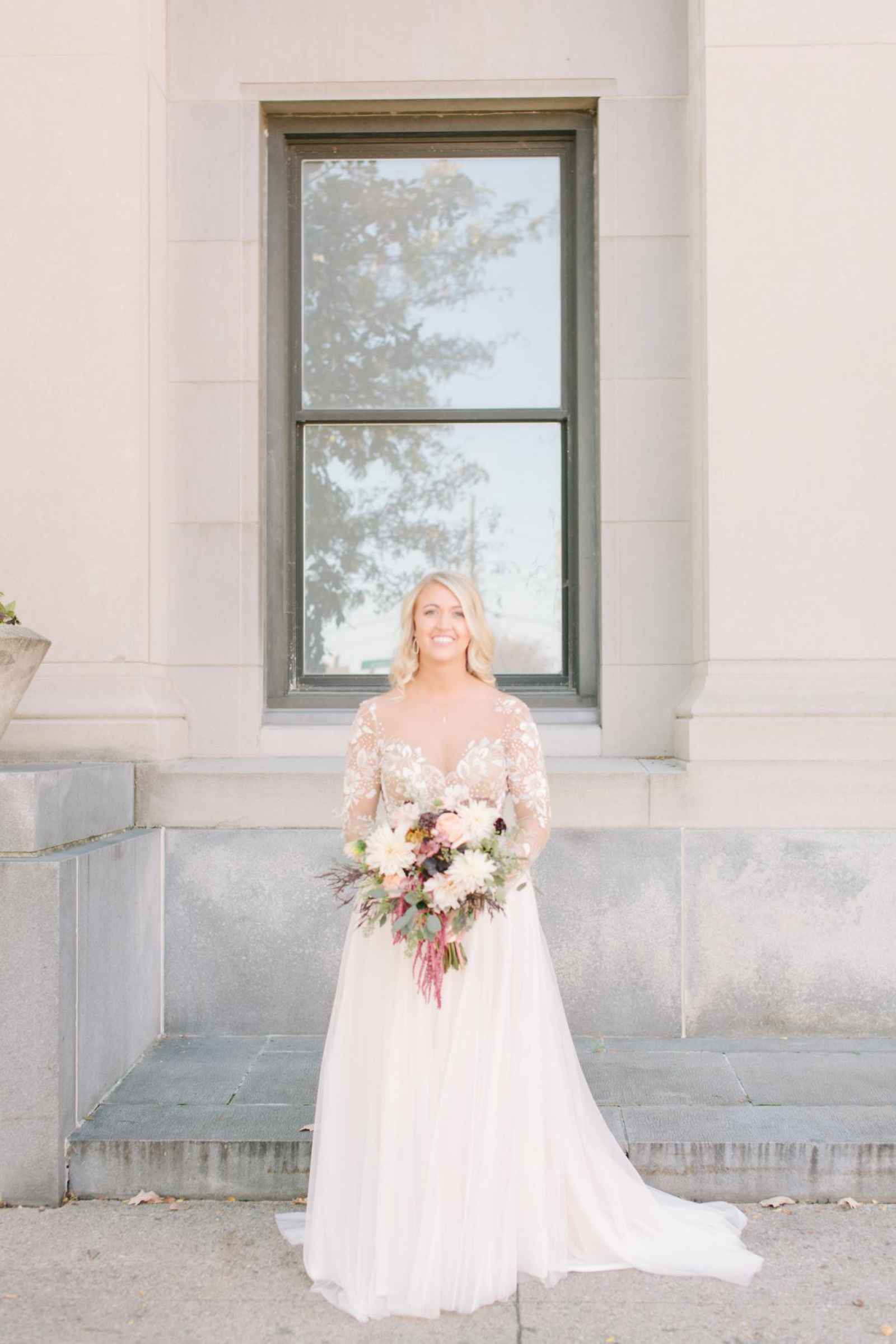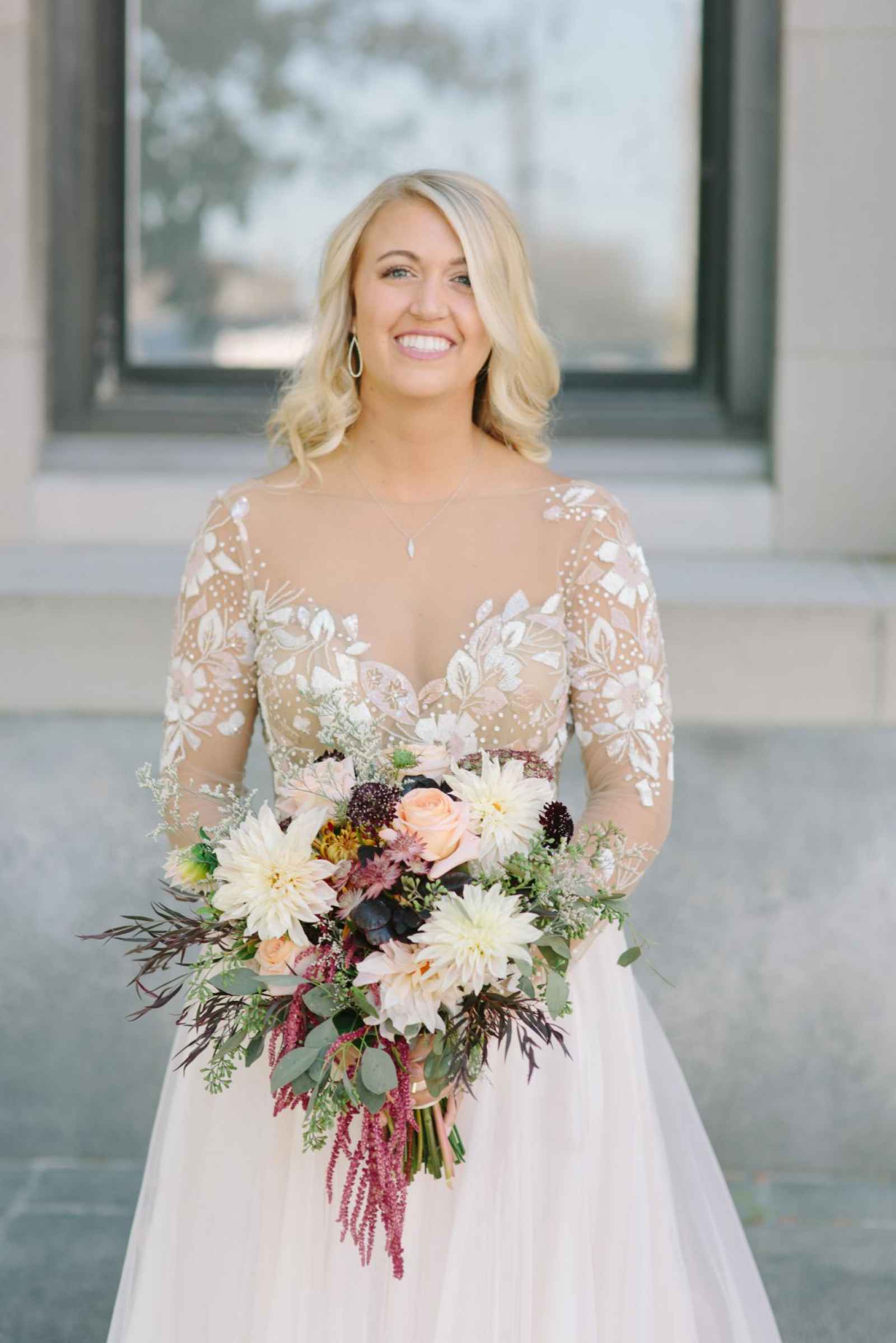 Jodie from Aisle Ready Events proved to be a big help for the long-distance planning, especially when it came to nailing down vendors. Although the couple knew they wanted a fun celebration, Jodie also helped in terms of the vision. Kayla says, “Jodie helped give some guidance on whether my ideas would work or not and threw out some suggestions based off what I had envisioned and pinned.” We think you’ll agree that the gorgeous peach and burgundy-inspired vision that resulted was a perfect palette for fall.