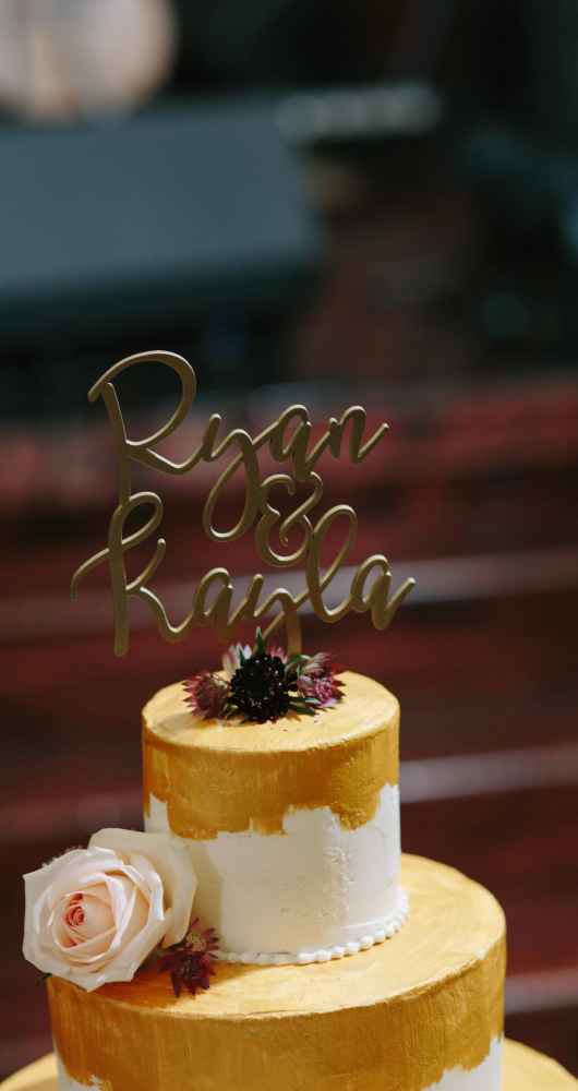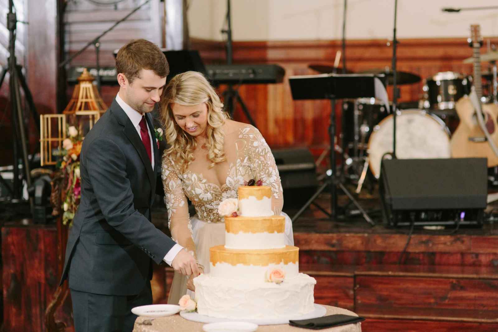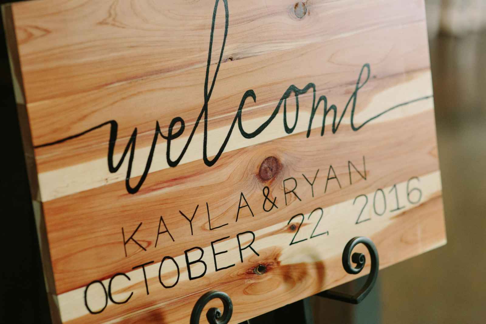 What unique touches made this wedding uniquely their own? A mix of different types of tables (to help create the party atmosphere), food stations throughout and region-specific food items (tenderloin sandwiches for Indiana and chicken and waffle sliders for Alabama). “We also tried to make the décor and colors similar to what we would have in our home to really feel like us,” Kayla adds. The couple’s one-of-a-kind favors were wooden coasters hand-cut by Ryan and branded with their monogram. Kayla also crafted BHLDN-inspired plates used for the cake cutting.
