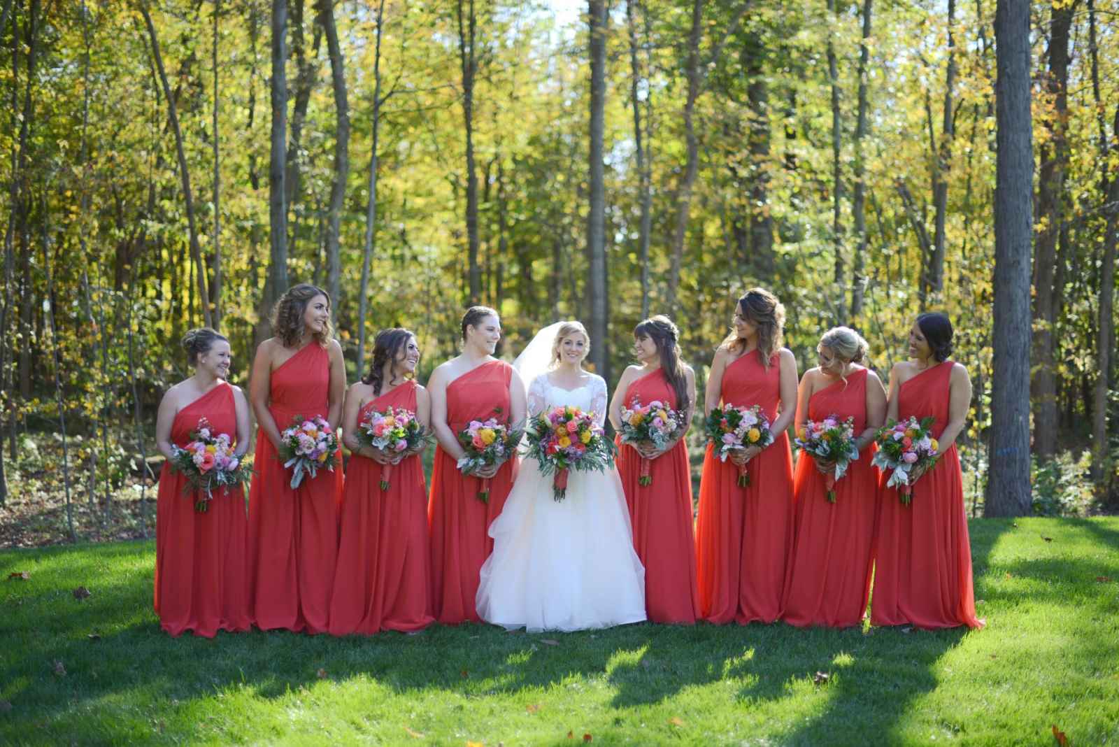 When it came to her wedding’s overall look, Kelli sought colors that would complement the late autumn season while also standing out. The persimmon color she selected for the bridesmaid dresses was just the pop she needed. A dark teal was paired with the persimmon, creating a gorgeous contrast.