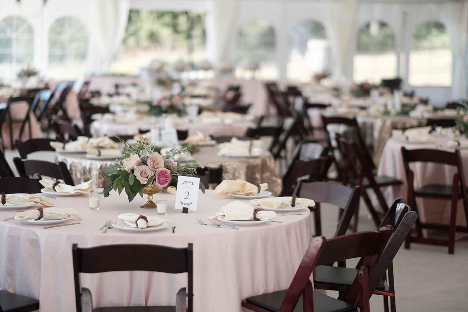 After choosing the perfect venue, Sarah got down to the details and landed on a classical theme. She says, “We chose blush, white and gold. We wanted to keep it simple and classic.” To go with this theme, she used items from The Rental Company to bring together the atmosphere at the reception.