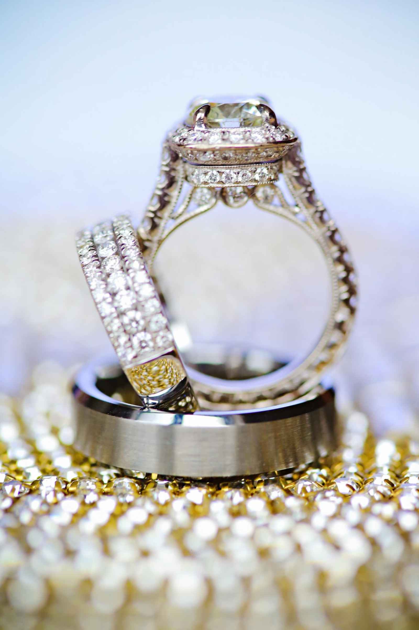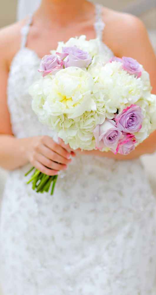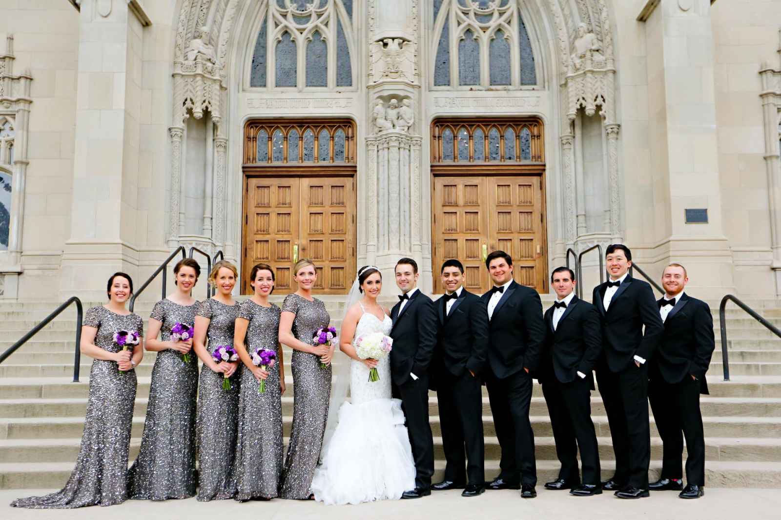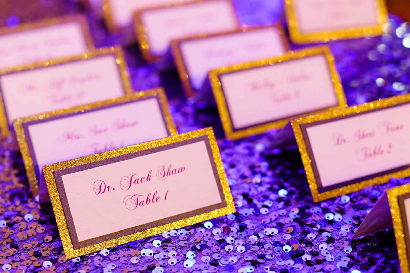 The color scheme of the wedding was Megan's favorite color, purple (as is should be!). The couple also wanted a glam wedding that would be unforgettable. The details were all pulled together to make their dreams come true. Megan says, “There were so many small touches that my planner added (like purple water in the flower vases!) that I loved. We also put fresh flowers on our cake in our lavender color. The uplighting was purple and we had drapes that really made the room feel dramatic and fancy.”
