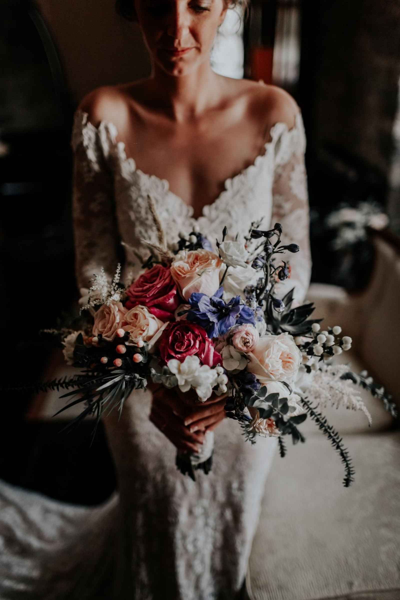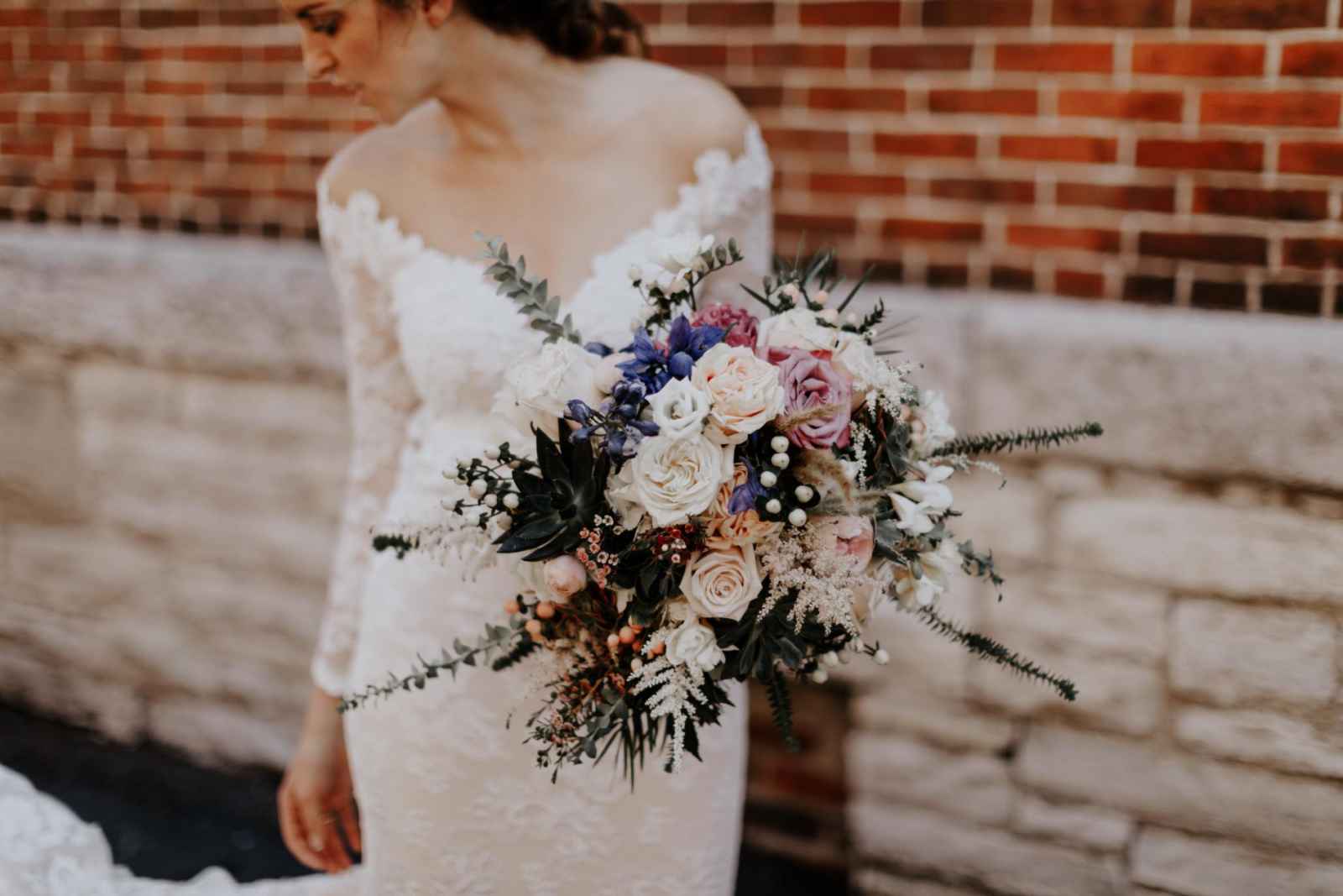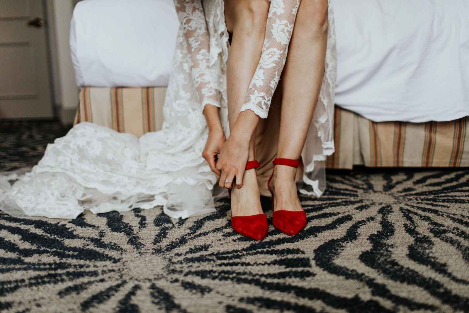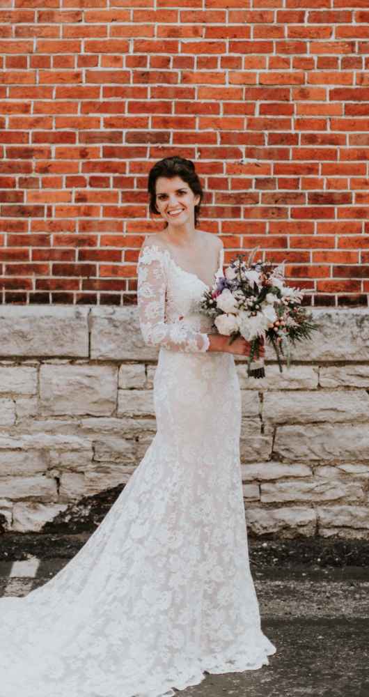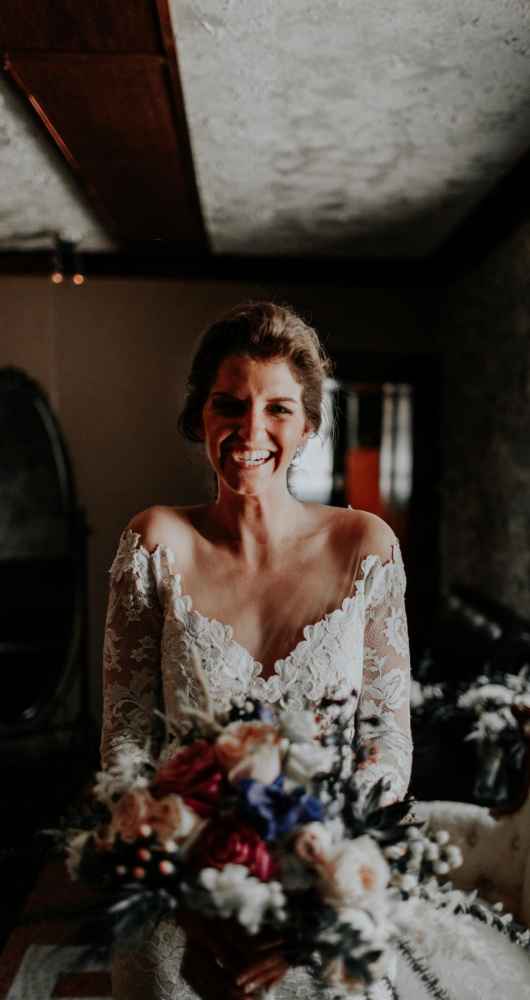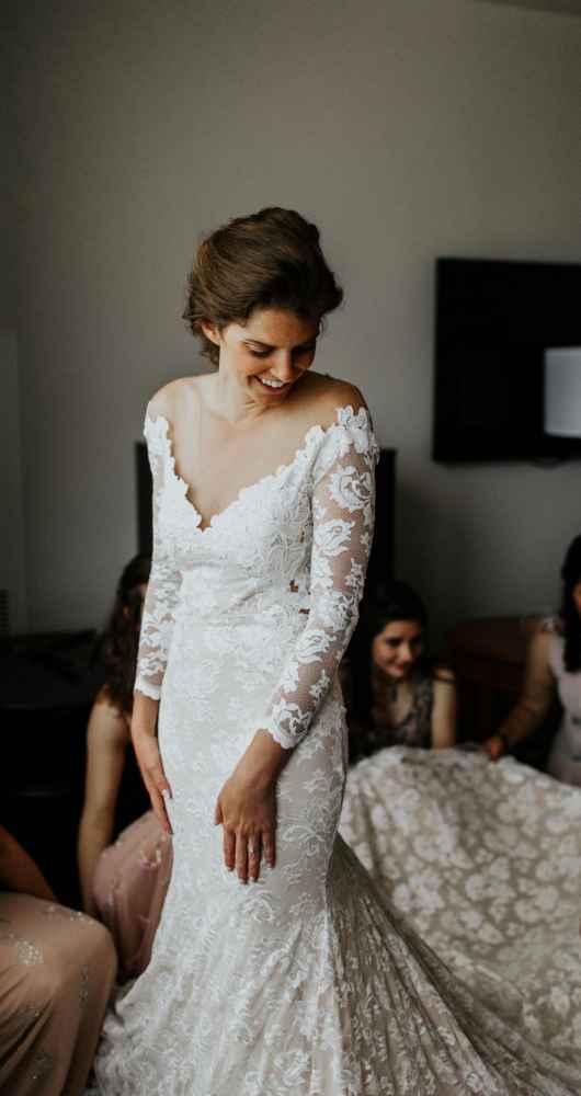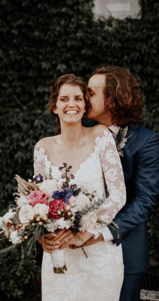 Rebecca bought her gorgeous Olvi's gown at Marie Gabriel Couture Bridal. Rebecca says, "I knew that I wanted a natural lace dress with sleeves with no frills but, Celeste, my bridal consultant, definitely had to give me a confidence boost. I LOVED the dress when I first put it on, but I remember feeling as if it were too fancy. All it took was Celeste to say, 'Giiirl you look sexy, gorgeous and you deserve to feel that way.' It was easily the best advice I got for my day-of look. I felt like a rock star in my dress."