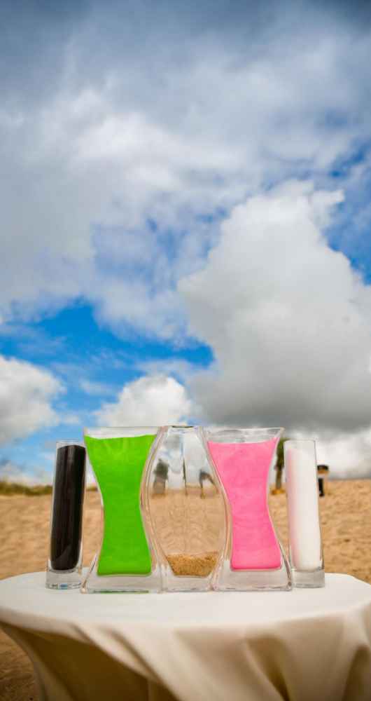 Scott and Caisha spent the next year planning their non-traditional beach wedding. When it came to choosing colors, they each agreed to pick one without consulting the other. The end result was lime green and hot pink. They also went to several bridal expos with Scott's mom and dad--the guys were responsible for tracking down photographers and DJs, the girls took care of everything else. Scott and Caisha had decided on a photographer out of Indianapolis when local photographer Christi Nelson approached them at a bridal show. She'd heard them talking about their beach wedding and said she really wanted to shoot it. They checked out her portfolio online and decided it was a perfect fit.