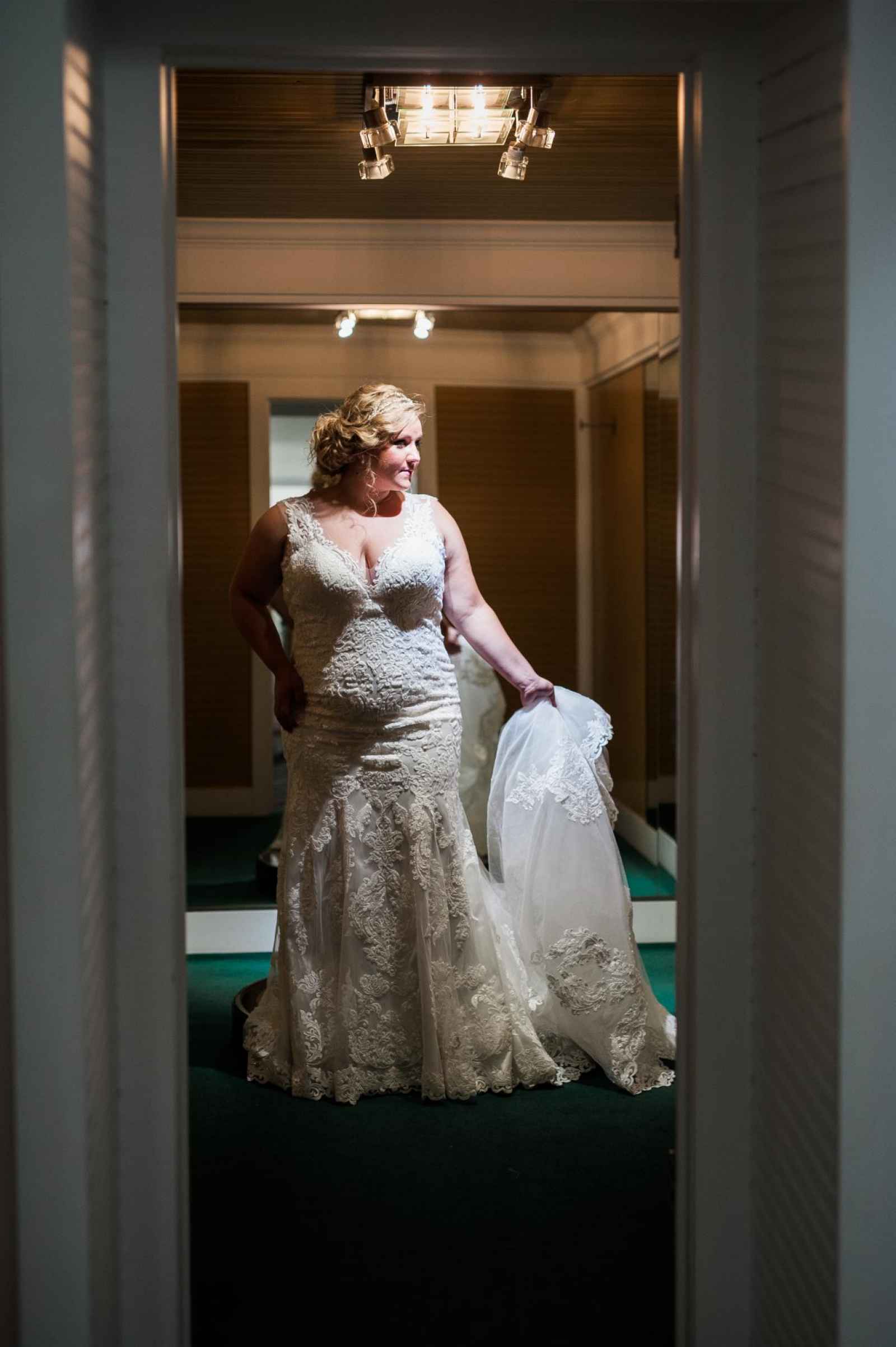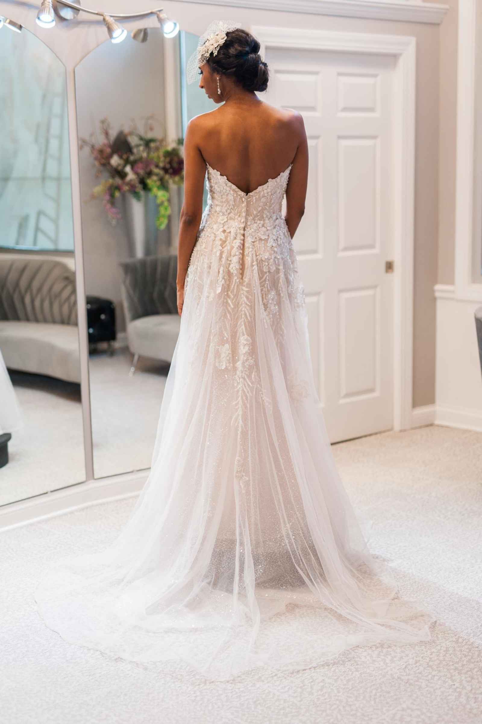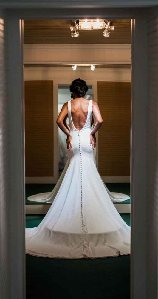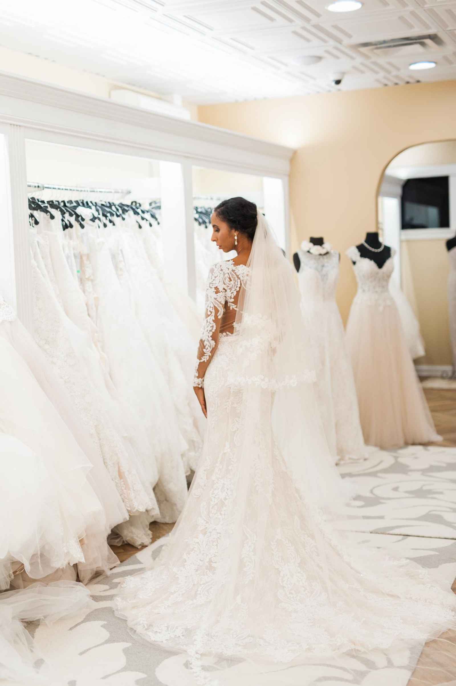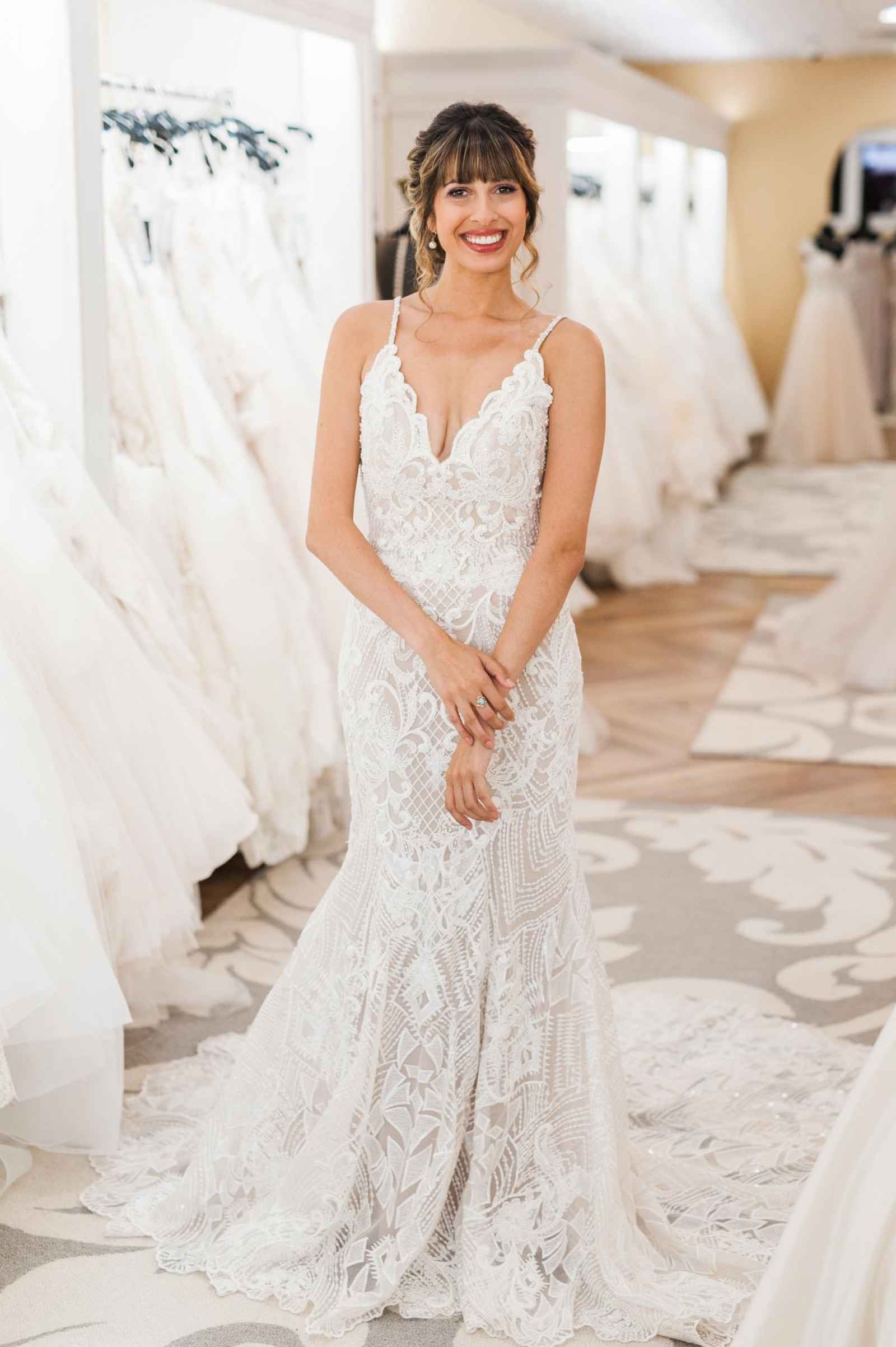 One of Becker’s most special features is their famous Magic Room. Alyssa says, “It is a 360 degree room of infinity mirrors and soft lighting so the bride can really envision herself in the special moment of wearing her gown on her wedding day.” All the elements of this room let a bride feel like true royalty. It offers endless reflections of the bride in her gown that assure her she looks beautiful from every angle. Better yet, the Magic Room’s ambiance creates a feeling of serenity letting a bride know she has found the one.