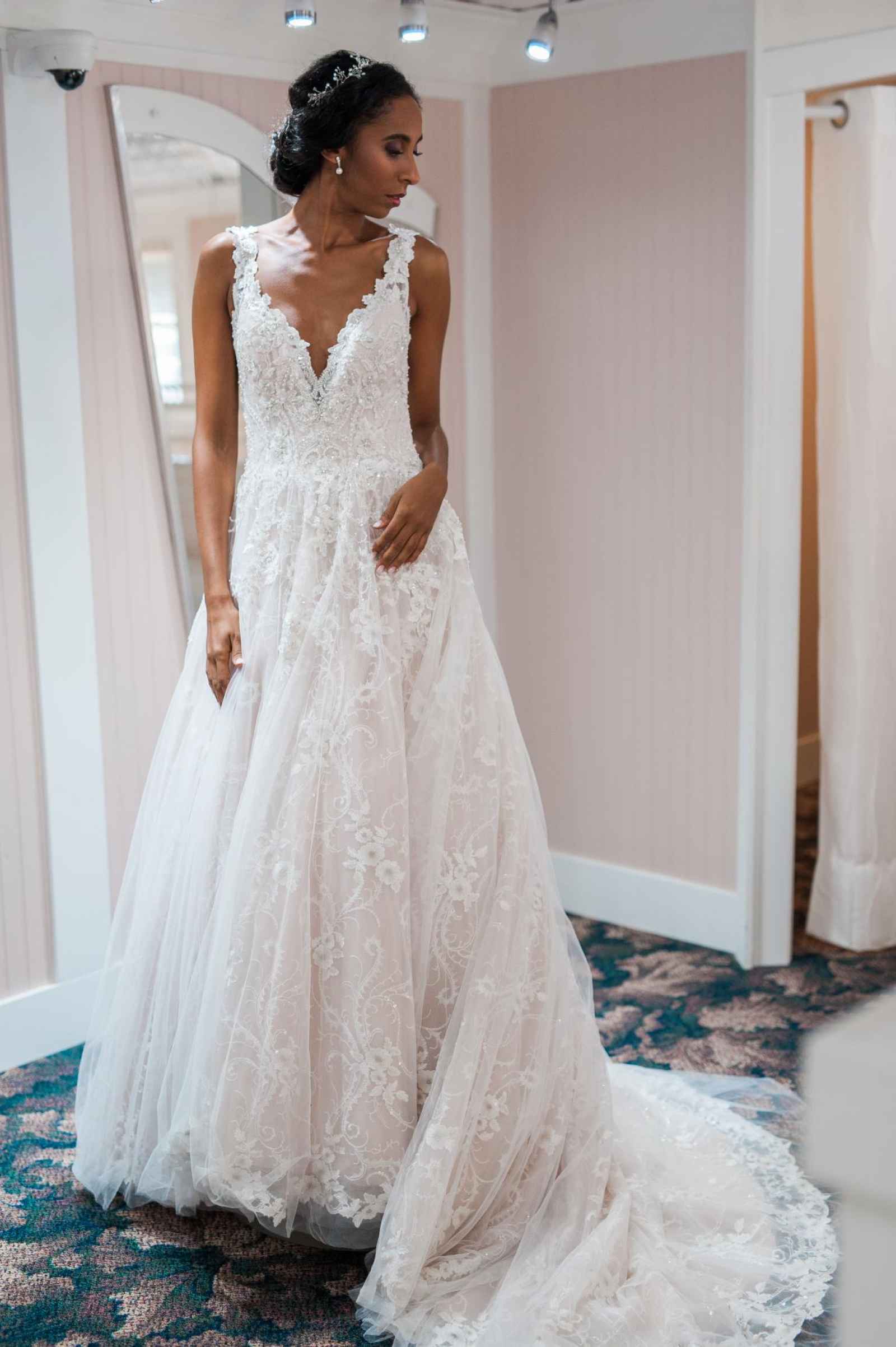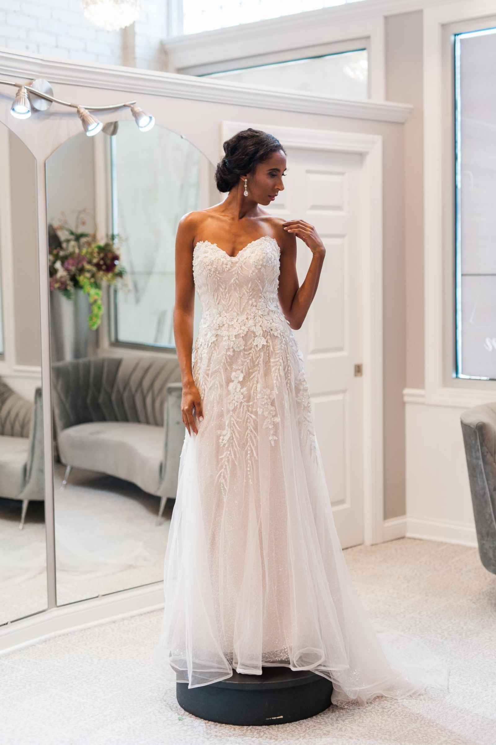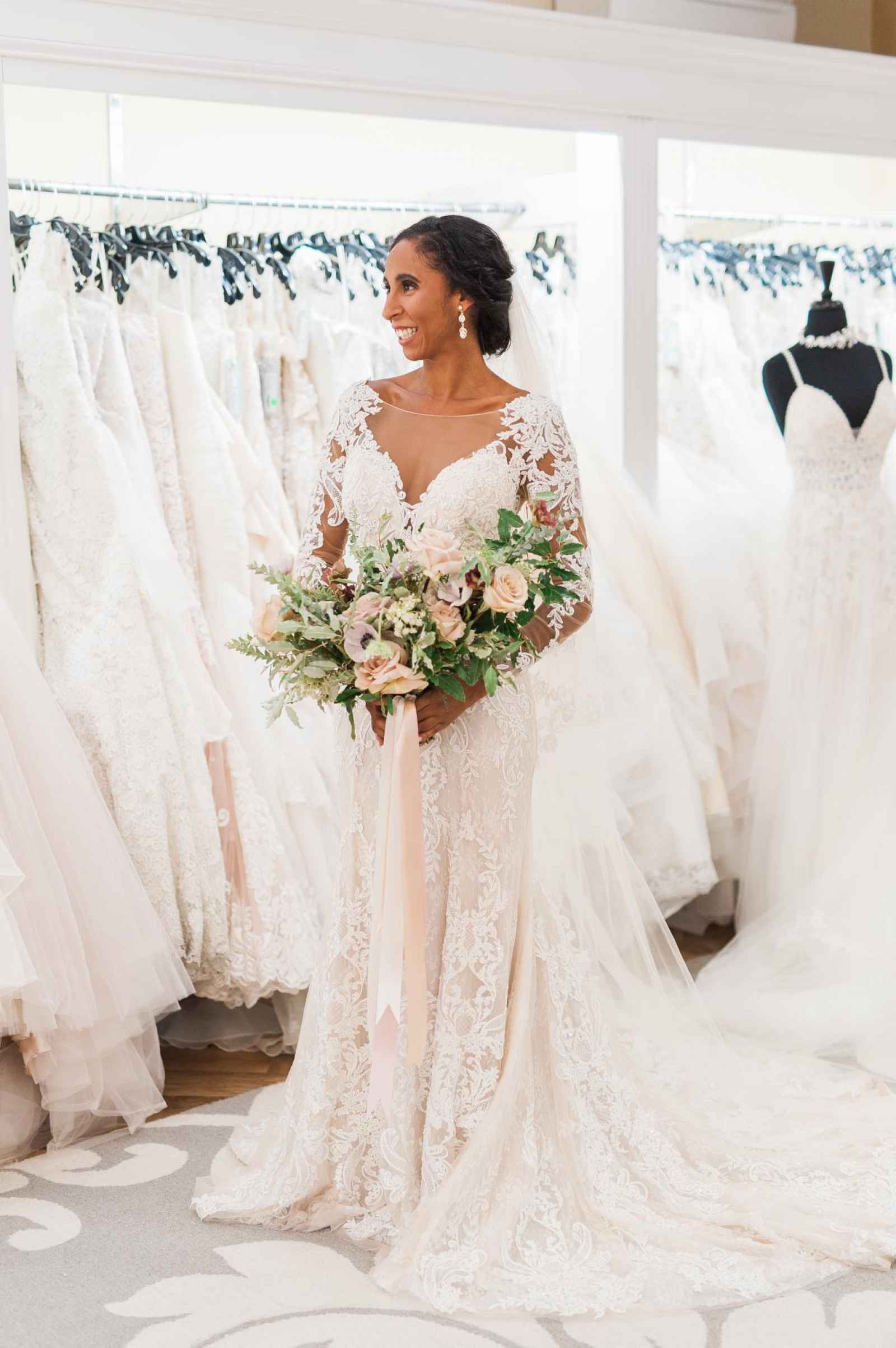 One of Becker’s most special features is their famous Magic Room. Alyssa says, “It is a 360 degree room of infinity mirrors and soft lighting so the bride can really envision herself in the special moment of wearing her gown on her wedding day.” All the elements of this room let a bride feel like true royalty. It offers endless reflections of the bride in her gown that assure her she looks beautiful from every angle. Better yet, the Magic Room’s ambiance creates a feeling of serenity letting a bride know she has found the one.