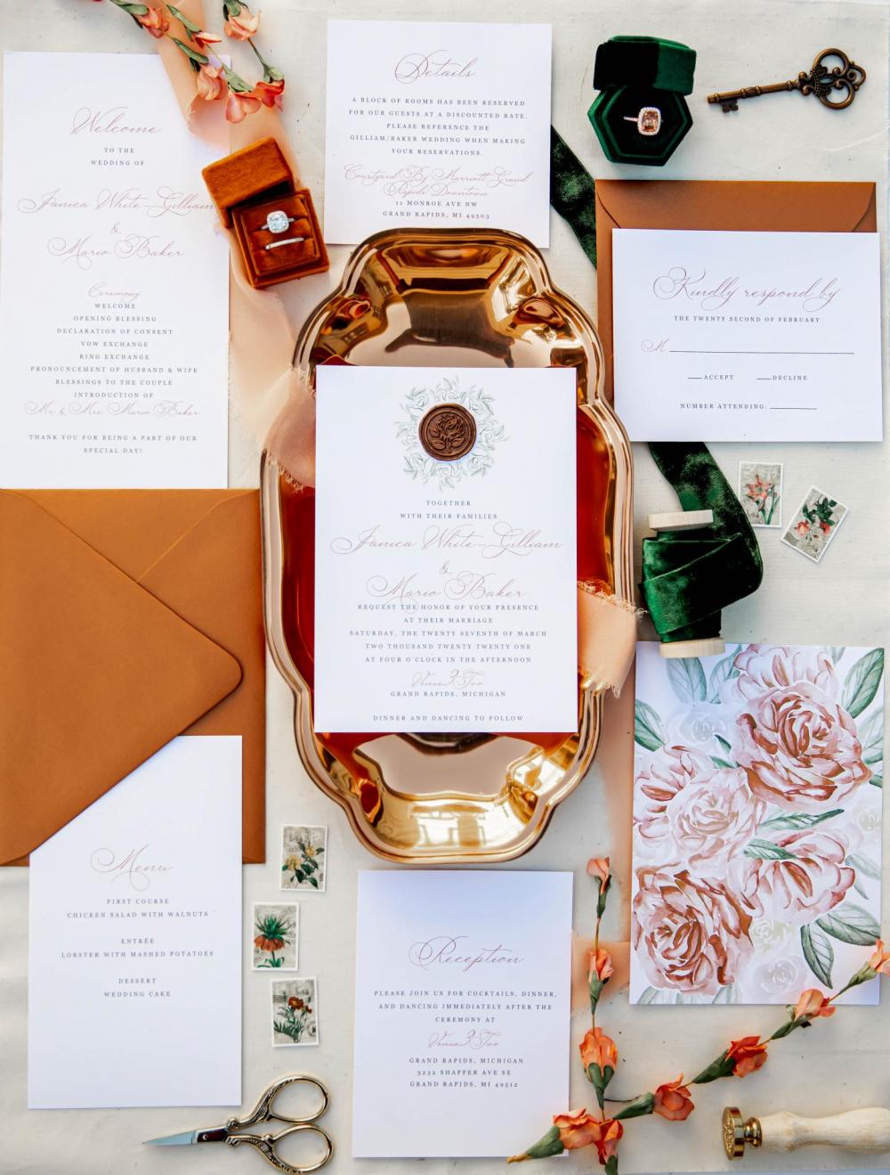After getting the chance to design a style shoot at Venue3Two in Grand Rapids, Michigan, Tushona of Tushona Monét Photography wanted to make the space as elaborate as possible. "Veneu3Two is such a luxurious wedding venue, and that’s what I wanted to go for," Tushona gushes. "I wanted to create a shoot that really showcased and catered to the venue."