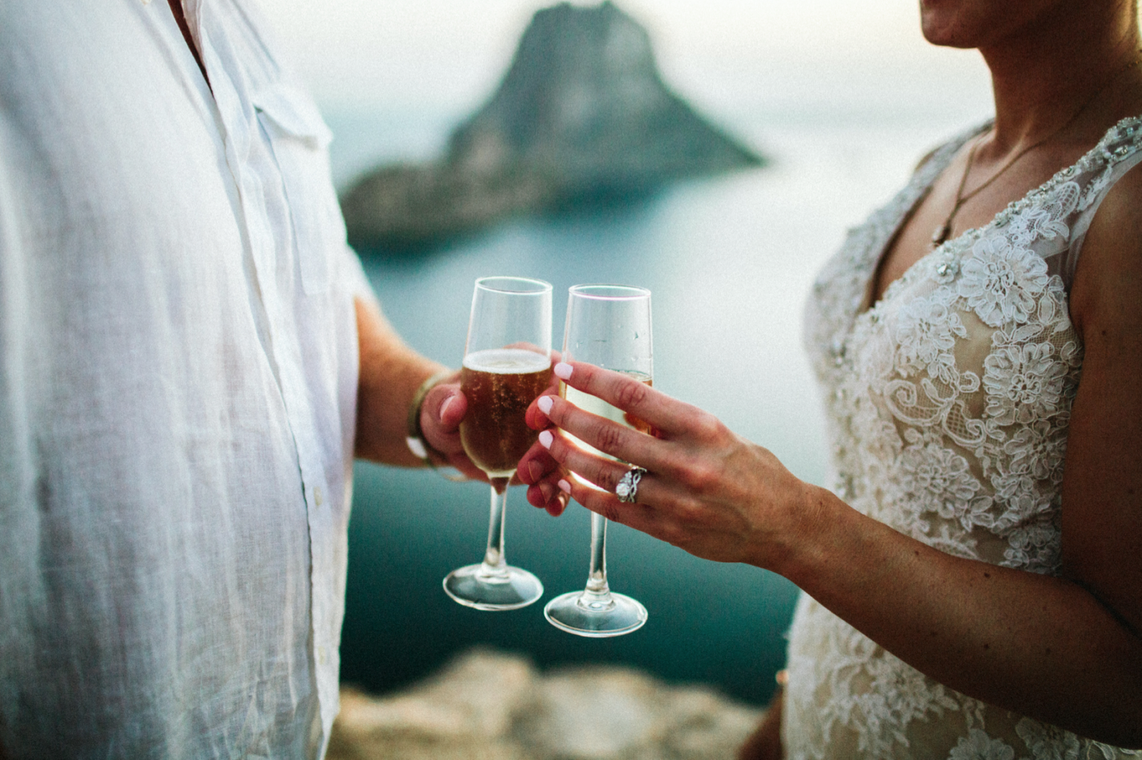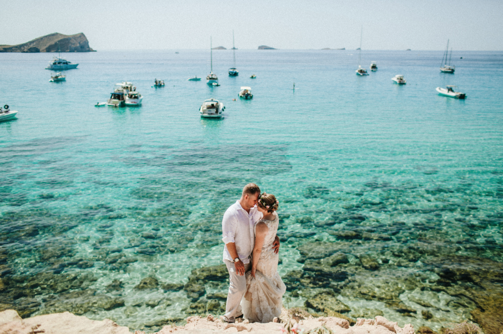 Photography & Bouquet: Giving Tree Photography, Vows Location: Pirate Tower overlooking Es Vedra, Portraits Location: Cala Conta, Cliff Diving Location: Cala Salada, Post-Ceremony Dinner, Hair Salon, Massage & Champagne: Grand Palladium White Island Resort and Spa, Dress: JJ's House, Nail Salon: KMCC “The Spa”, Bride's Rings: Blue Nile, Groom's Ring: Ring-Littman Jewelers, Earrings: The Cherish Collection, Bracelets & Groom's Shirt: Michael Kors, Right Hand Ring: Helzberg Diamonds, Floral Crown: Emily Rose Flower Crowns, Eyelash Extensions: Lashes on 5th, Honeymoon: Hardangerfjord Tour booked through Norway in a Nutshell