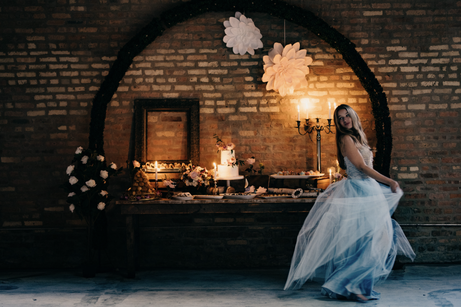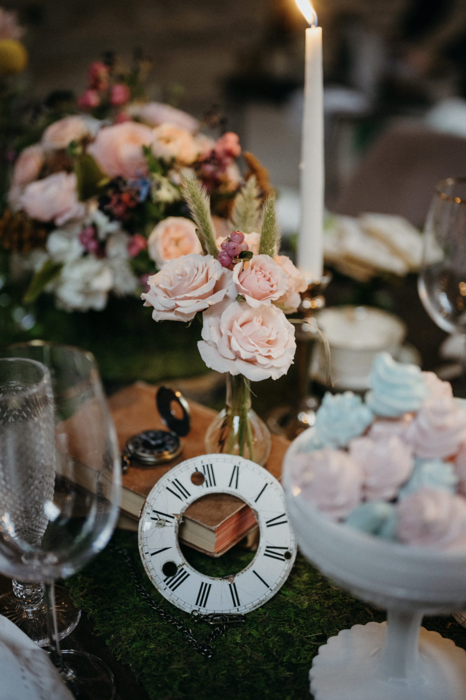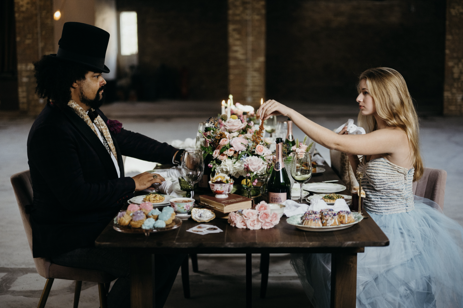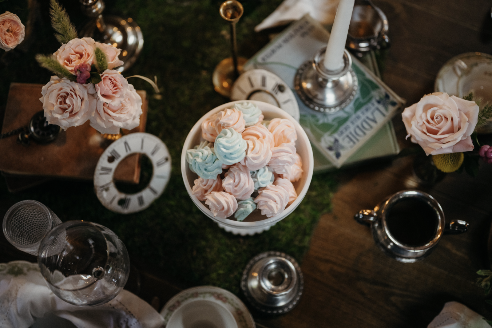 You won’t want to be late for this very important date! This Alice in Wonderland themed style shoot takes whimsical style to a whole new level. A variety of “Eat Me” cookies and deck of card tarts are perfect finger desserts to satisfy a curious sweet tooth. Vintage china and flatware are surrounded by beautifully calligraphed oyster shells, vintage books, moss and candles to make this tablescape truly enchanting. The woodsy details continue in the eclectic lounge area, showcasing birch logs, moss and a vintage bird cage. This moody bride and mad-hatter groom act as the centerpiece for this dramatic scene!
