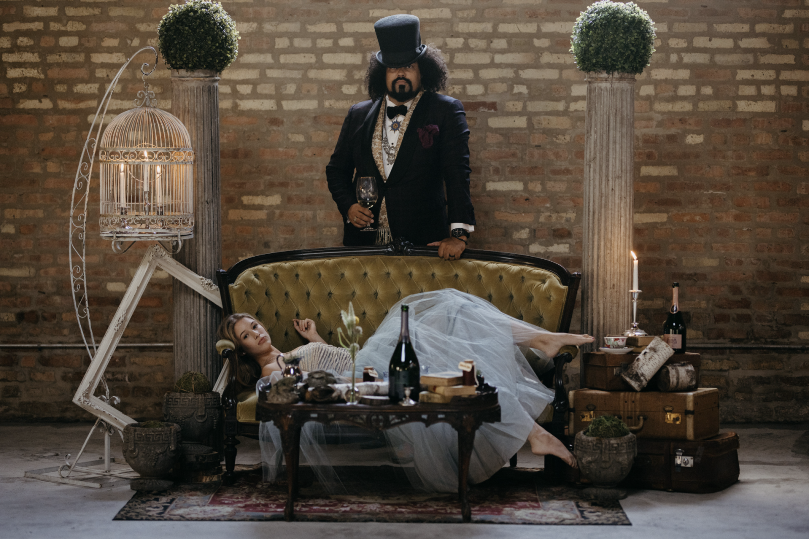 We love this couple’s eclectic looks! From the bride’s blue ballgown to the groom’s patterned vest and top hat, these two are dripping in dramatic style!