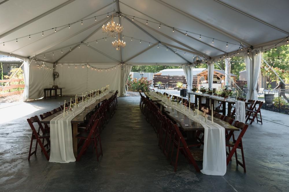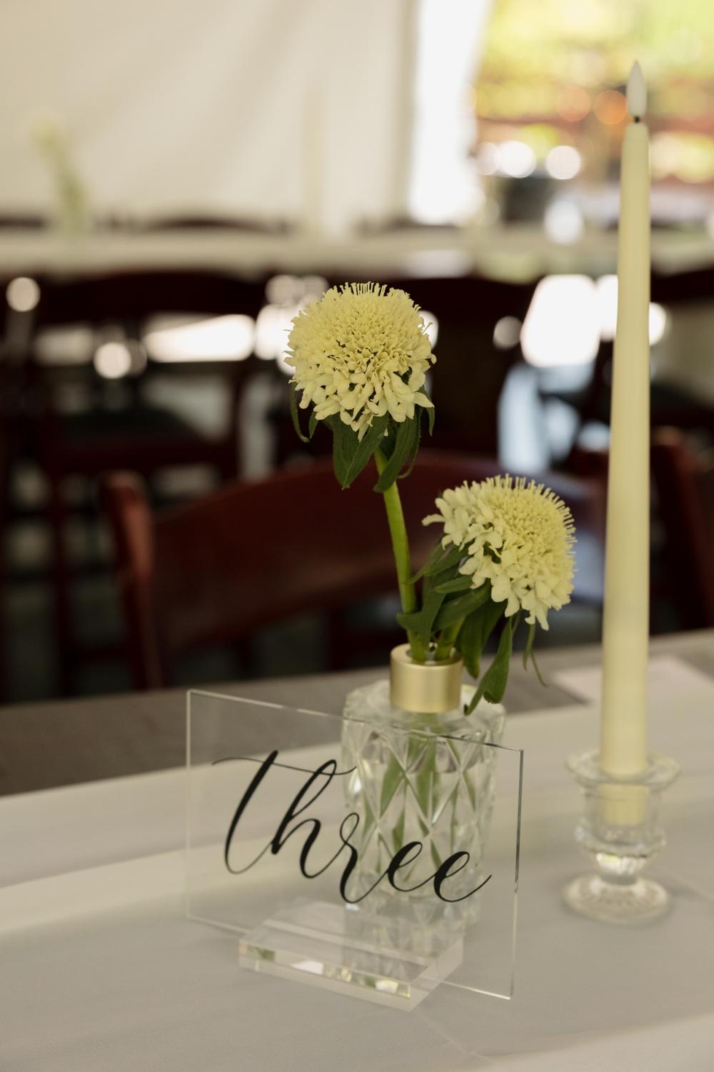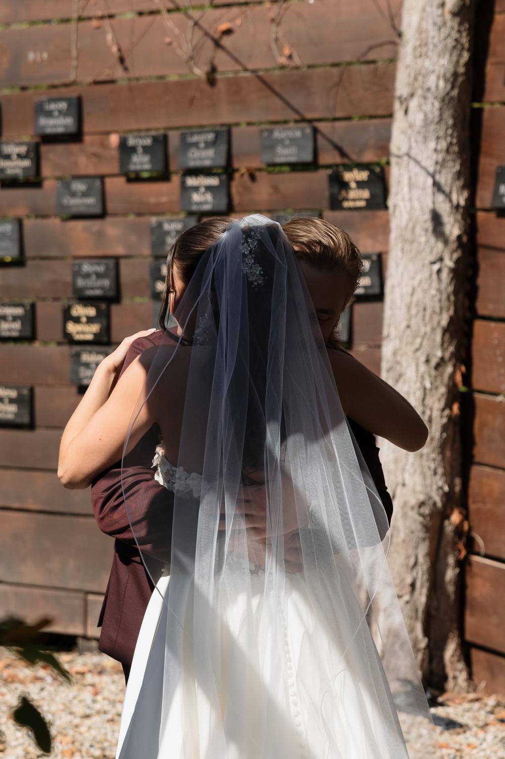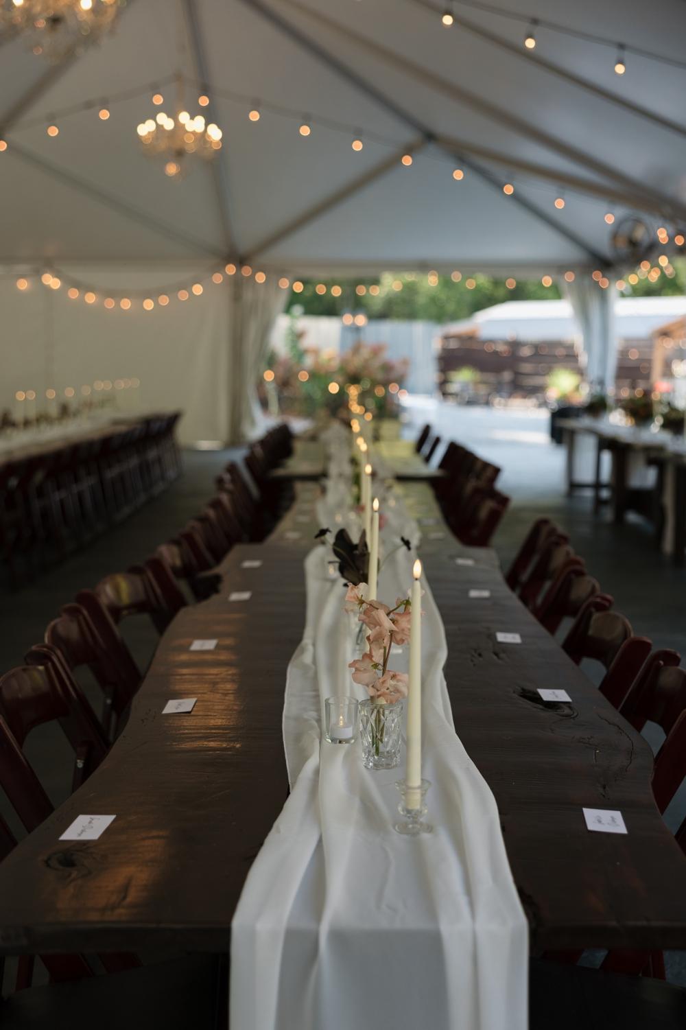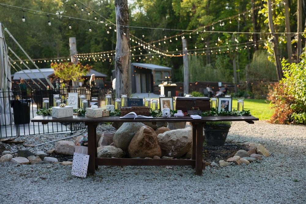 Since their engagement started in nature and their theme was relaxed and comfortable, Destina and Zachary decided on a soft, neutral color palette centered with natural shades of green. "We were inspired by the setting of the venue and wanted everything to feel cohesive with the outdoor surroundings," Destina gushes. With the help of some candles and additional greenery, they were able to create the woodland fairytale wedding that they wanted! We love their choice to not use a linen on their wooden tables. The unique texture and deep color of the wood blends so beautifully with the delicate details they placed on their tablescapes!
